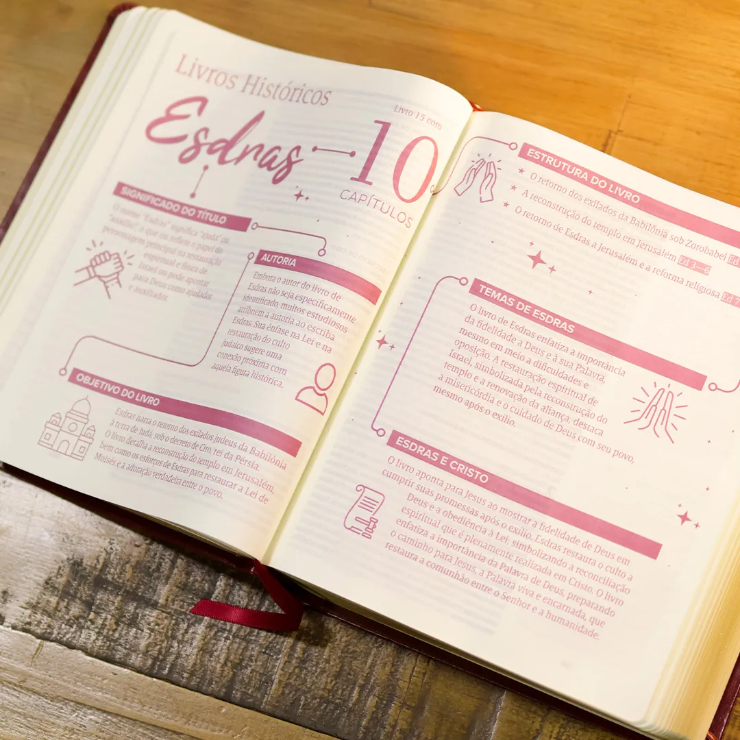 Elaborada com carinho pela pastora Viviane Martinello, esta edição foi pensada para acompanhar você em sua caminhada com Deus. Com espaços para anotações, mapas mentais, introduções aos livros, frases inspiradoras e fonte confortável, ela é perfeita para levar consigo todos os dias.