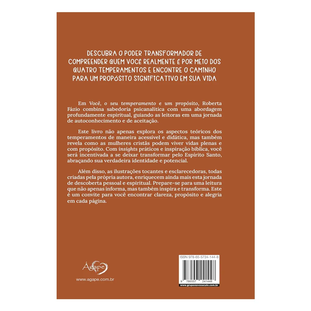Em Você, o seu temperamento e um propósito, Roberta Fázio une psicanálise e espiritualidade para guiar mulheres cristãs em uma jornada de autoconhecimento. A partir dos quatro temperamentos, o livro oferece reflexões acessíveis, inspiração bíblica e ilustrações autorais que ajudam a descobrir sua verdadeira identidade e viver com propósito. Uma leitura que inspira transformação, clareza e fé.